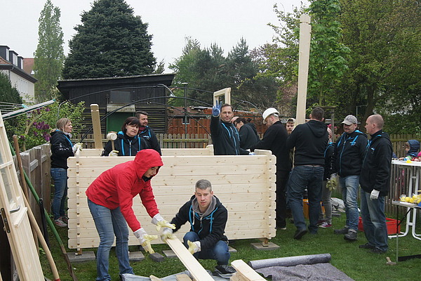 Hofmann-Mitarbeiter bauen gemeinschaftlich eine individuelle Gartenlaube für die Kindertagesstätte Christopherus