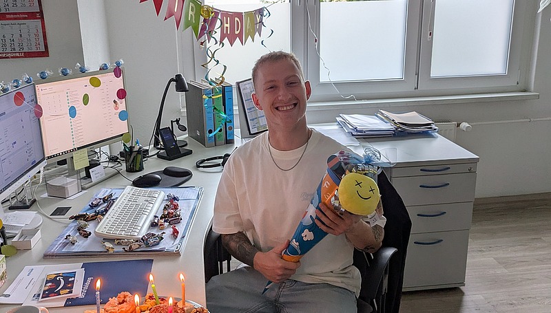 Azubi der Niederlassung Fürth, Feliciano Angerer, erhält Originaltrikot der SpVgg Greuther Fürth.