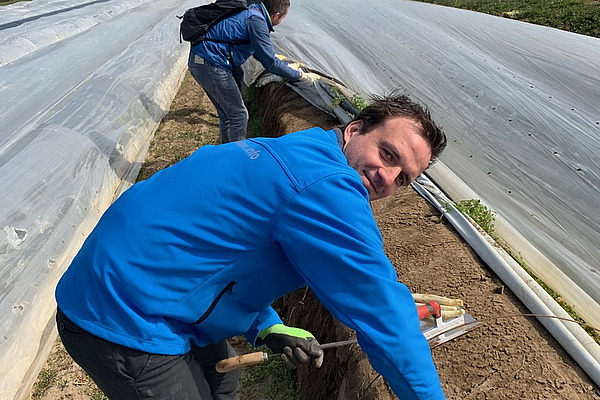 Hofmann-Mitarbeiter unterstützen bei der Spargelernte. Hinzuverdienst zum Kurzarbeitergeld ist bis zu 100% des bisherigen Lohns problemlos möglich.