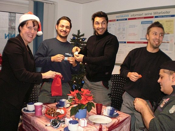 Dezember 11 – Wie jedes Jahr um diese Zeit wurde es in der Hofmann-Niederlassung Hannover herrlich weihnachtlich. Ein geschmückter Christbaum, Lichterketten, Gebäck, stimmungsvolle Musik und Geschenke überall sorgten dafür, dass jeder, der die Niederlassung betrat, sofort wusste: es weihnachtet sehr! Am 16. Dezember war es wieder soweit und alle Mitarbeiter waren dazu eingeladen, bei leckeren Snacks und Getränken das fast abgelaufene Jahr 2011 Revue passieren zu lassen und über Pläne und Wünsche für 2012 zu plaudern. Trotz des ungemütlichen Wetters kamen viele Mitarbeiter der Einladung nach und ließen sich von der allgemeinen Weihnachtsstimmung anstecken. Da man ja bekanntermaßen mit guten Traditionen nicht brechen soll, gab es natürlich auch dieses Jahr wieder die beliebte Geschenke-Tombola. „Jedes Los gewinnt“ - unser Motto, damit kein Mitarbeiter ohne Päckchen nach Hause gehen musste. Schön war´s – wie jedes Jahr!