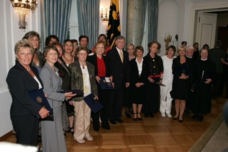 Juni 07 Es ist nicht üblich, dass der Bundespräsident persönlich den Verdienstorden übergibt. Doch dieses Jahr machte er eine Ausnahme, denn am 21. Juni wurden ausschließlich Frauen für ihre Verdienste ausgezeichnet. „Mir liegt sehr viel daran, auf Maßstäbe in unserer Gesellschaft aufmerksam zu machen, die vielleicht erklären können, warum noch immer weit weniger Frauen als Männer für eine Auszeichnung mit dem Verdienstorden vorgeschlagen werden. Zwar ist der Anteil der Ordensträgerinnen seit 1990 von 16 auf 25 Prozent angestiegen. Doch gemessen am Anteil der Frauen an unserer Bevölkerung und an ihrem vielfältigen Engagement ist das immer noch viel zu wenig! Deswegen nehme ich seit Oktober letzten Jahres Vorschlagslisten nur noch an, wenn von zehn Kandidaten mindestens drei Frauen sind“, so Horst Köhler in seiner Rede.
