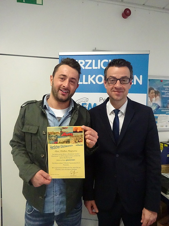 März 2016 - Unsere Aktion „Mitarbeiter werben Mitarbeiter“ trägt immer wieder Früchte. Das Prinzip: Mitarbeiter empfehlen Hofmann Personal an Freunde etc. weiter, die sich dann bei uns bewerben und bestenfalls eingestellt werden. Als Dankeschön für die Empfehlung erhält der Empfehlende 100 Euro und nimmt automatisch an einer Verlosung teil, bei der es eine Reise nach Mallorca zu gewinnen gibt. Der glückliche Gewinner war diesmal Mattia Magnani.