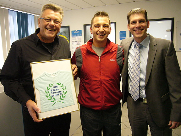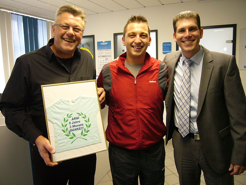 September 2012 - Mit einem lachenden und einem weinenden Auge verließ uns nach knapp 10 Jahren Betriebszugehörigkeit die „Legende“ der Niederlassung Schwandorf: Arnold Flut wechselte Dank seiner sympathischen und freundlichen Ausstrahlung und seiner sehr guten Arbeitsweise im September 2012 zu einem Kunden in Wackersdorf als Schichtführer/Meister.