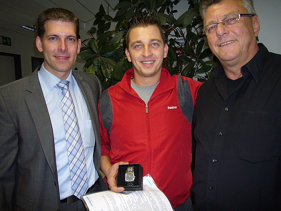 Als Dank für seine geleistete Arbeit überreichten Oliver Berghausen und Dietmar Burkhardt dem geschätzten Kollegen eine Armbanduhr mit einer persönlichen Gravur. Und auch Arnold Flut bedankte sich mit einer kleinen Aufmerksamkeit bei seinem Betreuer und mittlerweile gutem Freund Dietmar Burkhardt.