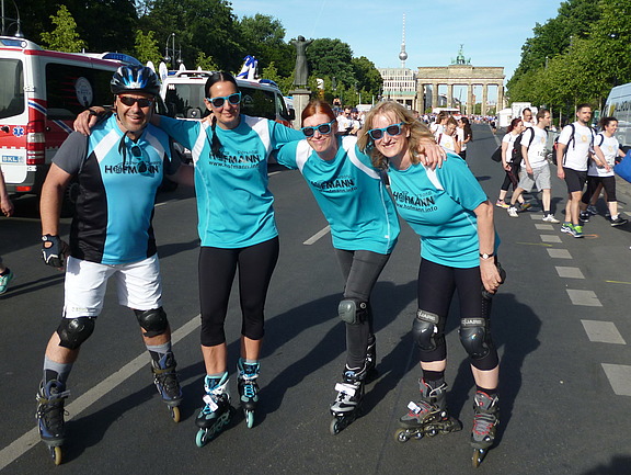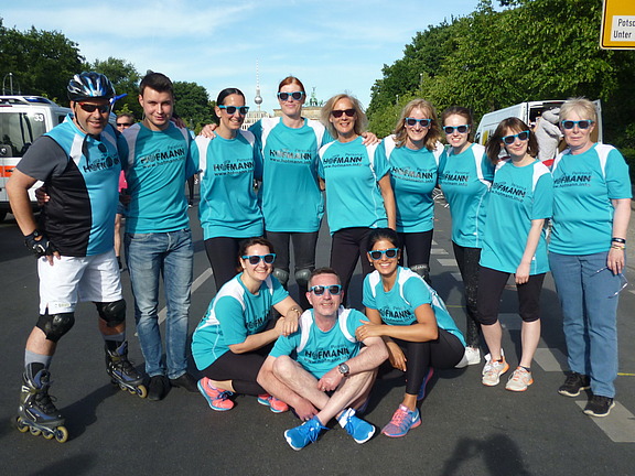Schon um 16.30 Uhr traf man sich in der Niederlassung, um noch gemeinsam etwas zu essen und sich dann vorzubereiten. Ein Warm-Up gab’s an der Laufstrecke am Brandenburger Tor bevor um 19.20 Uhr als Erste die Skater, Skateboarder und Einrad-Fahrer an den Start gingen. Es folgten die Läufer und dann eine ungeheuer große Zahl an Walkern.
