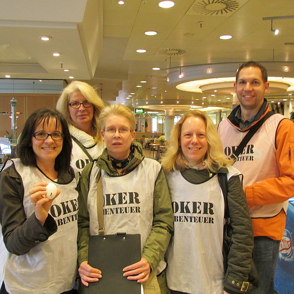 Gesagt, getan – und so wurden zwei Teams gebildet, die in der Stadt zwei identische - nichtsdestotrotz aber eher ungewöhnliche Aufgaben - zu lösen hatten: Jeweils ein rohes Ei wurde mit Glacéhandschuhen durch die Stadt befördert, mit dem Auftrag, dieses in einen gekochten Zustand zu versetzen. Wie bitte kann das gehen?! Team 1 überzeugte das Restaurant Karstadt, Team 2, ein Café, das Ei via Mikrowelle oder Eierkocher verzehrbar zu machen. Bei der zweiten Challenge sollte ein „Flachmann“ Jägermeister gegen etwas Nützliches getauscht werden. Auch das gelang beiden Teams und so erfreute sich eine Mitarbeiterin an hübschen Haarklammern – der „Konkurrenz“ war Nahrung wichtiger, was sie durch den Verzehr zweier eingetauschter Brötchen bewies.