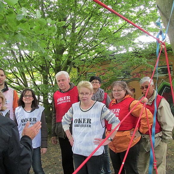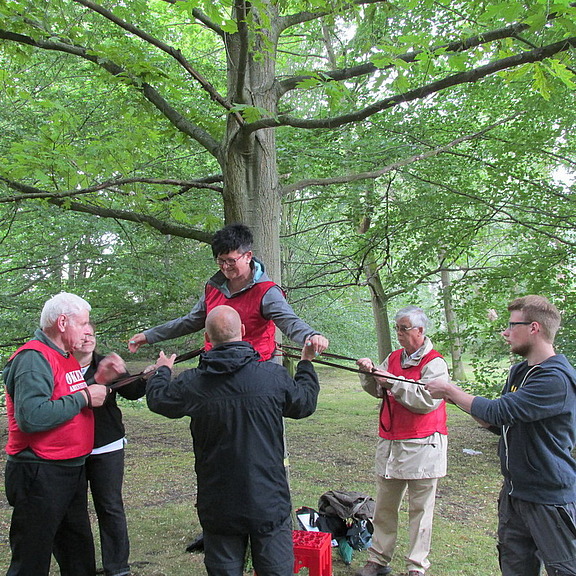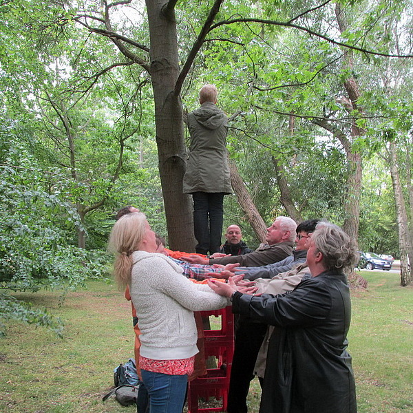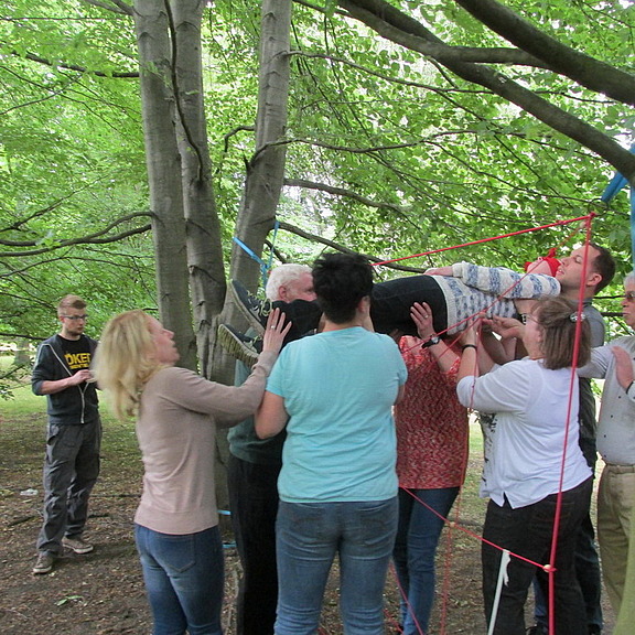 Nach diesen Erfolgen marschierten beide Trupps in einen Park, in dem bereits die nächsten Aufgaben warteten. Andrea Pils erzählt: „Hier ging es um Strategie und Geschick. Jeder aus dem Team musste bspw. durch die Öffnung eines riesigen Netzes befördert werden. Der Clou an der Sache: Wenn einer durch war, wurde diese Öffnung verschlossen!“