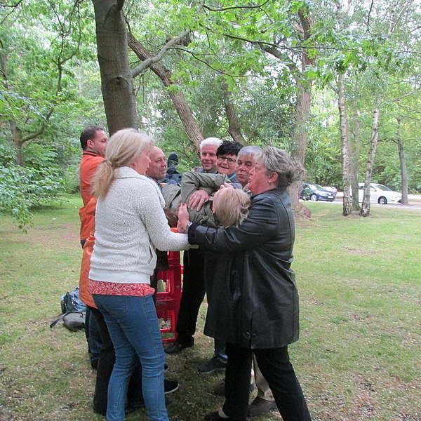 Zeitarbeitsmitarbeiterin Marion Krüger war mutig und vertraute ihrem Team, indem sie sich in freiem Fall von ihren Kollegen auffangen lies - und dafür gebührenden Applaus erntete.