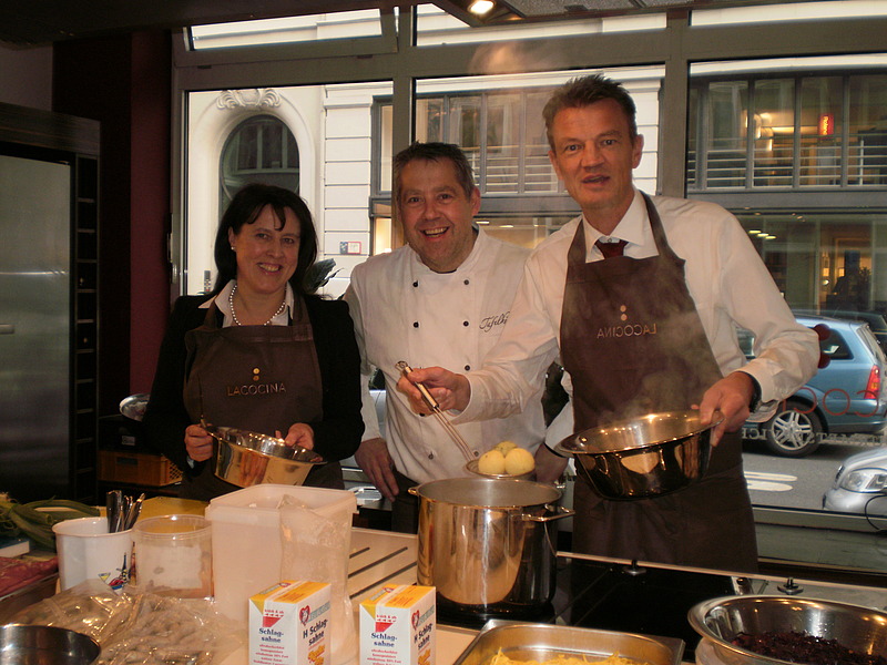 November 11 - Üblich ist es, Kunden zum Essen einzuladen. Aber das Hofmann-Team wollte etwas Besonderes und lud zum „Selbstkochen“ ins La Cocina ein. Ein 3 Gänge Menü stand auf dem Plan: von Spitzkohlsuppe bis Quarksoufflé mit Edelnougat Eis; auf dem Papier eine fast unlösbare Aufgabe für jeden Hobbykoch.