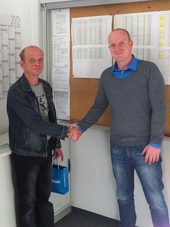 Als Dankeschön für die hervorragende Arbeit überraschte Michael Meinhold Hagen Siegel bei seiner Arbeit mit einem kleinen Geschenk und gratulierte ihm herzlich zu seinem „5-Jährigen“.