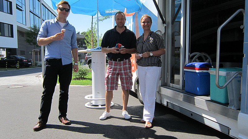 August 2015 - Mit dem Jobmobil und den Kühltaschen voller Eis ging es Anfang August für das Team der Niederlassung Rosenheim los. Die Mission an diesem Tag war klar: bei gefühlten 40 Grad für Abkühlung sorgen – und zwar bei Mitarbeitern, Kunden und Partnern. „Die Überraschung war uns geglückt. Das Eis ging weg wie nichts“, erzählt Personaldisponentin Alexandra Schmid-Hofstätter.