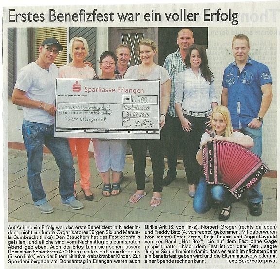 Ohne die Unterstützung namhafter Firmen wie Schaeffler, Sport Hoffmann oder Saturn wäre das jedoch nicht möglich gewesen. Dank Überzeugungskraft von Jürgen Six stellten sie alle für die Veranstaltung kostenfrei begehrte Sachpreise wie eine Auto-HiFi Anlage, ein Navigationssystem oder eine Kaffeemaschine für eine Verlosung zur Verfügung. Jürgen Six freut sich: „Niederlindach ist ein sehr spendierfreudiges und hilfsbereites Dorf, was sich in dem Spendenerlös in Höhe von € 4.700 gezeigt hat!“