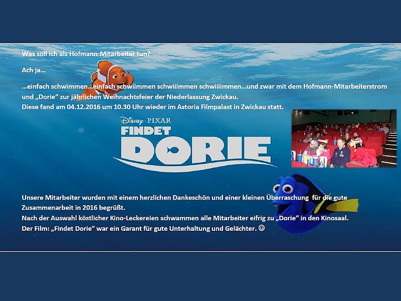 Dezember 2016 – Anfang Dezember trafen sich die Hofmann-Mitarbeiter im Astoria Filmpalast, um das Schicksal der blauen Paletten-Doktorfisch-Dame Dorie zu verfolgen. Die Mitarbeiter wurden mit einem herzlichen Dankeschön und einer kleinen Überraschung für die gute Zusammenarbeit in 2016 begrüßt. Nach der Auswahl köstlicher Kino-Leckereien konnte es sich jeder so richtig gemütlich machen und einfach mal abschalten.