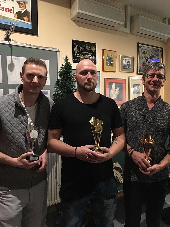 Zwischen den einzelnen Runden wurden diverse Häppchen gereicht und zum Finale wurden die drei besten Spieler Albert Strebel, Marcus Rak und Marko Kühnhardt mit Pokalen ausgezeichnet.