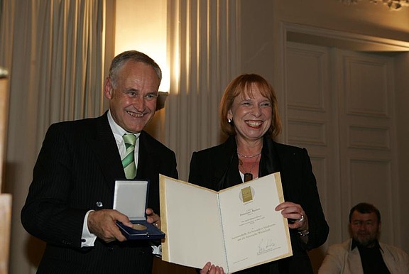 Nürnberg, 08. Nov. 06 – Gestern Abend wurde die Unternehmerin Ingrid Hofmann mit der Staatsmedaille für besondere Verdienste um die bayerische Wirtschaft ausgezeichnet. Übergeben wurde sie von dem bayerischen Staatsminister Erwin Huber, der in seiner Laudatio das breite Engagement Ingrid Hofmanns hervorhob. Er verwies u.a. auf ihr Amt als Vizepräsidentin des Bundesverbands Zeitarbeit Personaldienstleistungen e.V. (BZA), womit “Sie ganz wesentlich zur Akzeptanz dieser zukunftsträchtigen Dienstleistung beigetragen haben”. Doch auch ihr soziales und ehrenamtliches Engagement stellte er heraus, indem er sich u.a. auf ihre Mitarbeit im Präsidium und Vorstand der Bundesvereinigung der Deutschen Arbeitgeberverbände (BDA) bezog, wie auch auf die Übernahme ehrenamtlicher Mitarbeit in der Industrie und Handelskammer Nürnberg. Sein Fazit: “Sie haben vorbildliche Leistungen als Unternehmerin und im Ehrenamt erbracht.”
