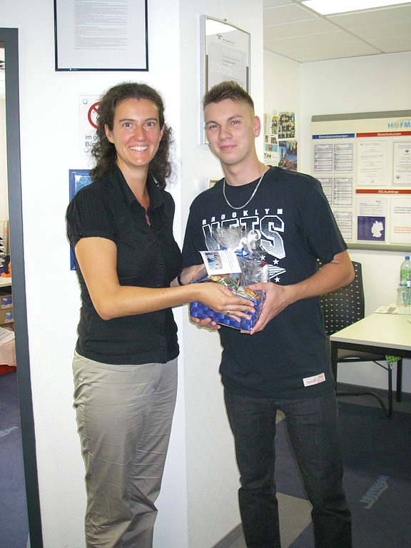 Mai 2013 - Nach seiner erfolgreichen Ausbildung zur Fachkraft für Lagerlogistik suchte Eric Hochstatter eine neue Herausforderung, die er dann auch bei der I.K. Hofmann in Marktheidenfeld fand. „Bei unserem Kundenunternehmen in Wertheim setzten wir ihn gemäß seiner Ausbildung als Fachkraft für Lagerlogistik ein“, berichtet Carolin Zimmermann. „Und nach neun Monaten hielt er bereits seinen Anstellungsvertrag des Kunden in den Händen. Wir sind uns daher mehr als sicher, dass Eric Hochstatter seinen Weg gehen wird!“