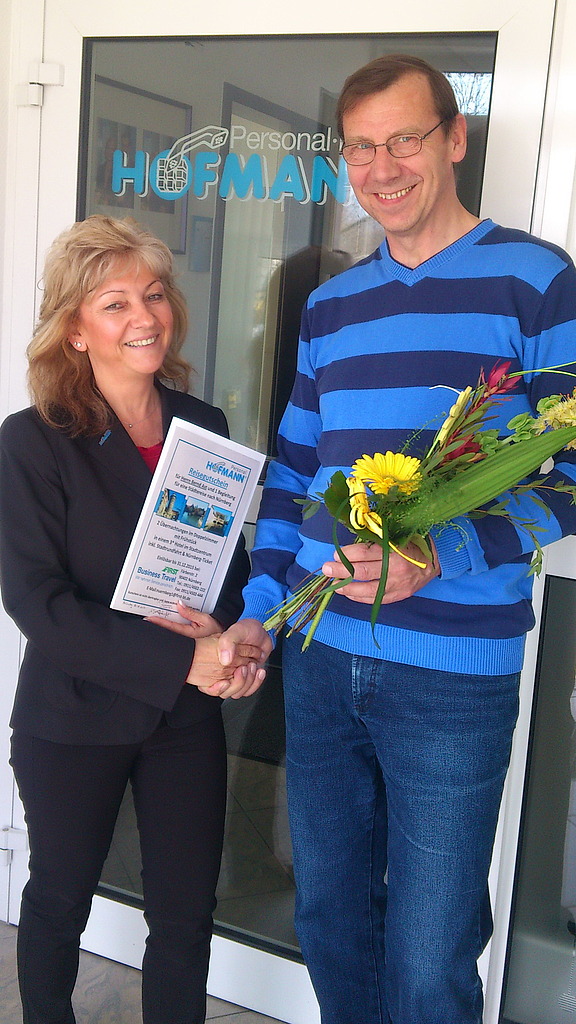 März 2014 - „Damit habe ich nun wirklich nicht gerechnet - das Mitmachen hat sich richtig gelohnt!“, freut sich Bernd Ast bei der Preisübergabe in der Niederlassung Eisenhüttenstadt über den Gewinn. Auf das Hofmann-Jobmobil am Marktplatz in Frankfurt/Oder ist Bernd Ast im vergangenen Jahr rein zufällig aufmerksam geworden. Schnell kam der diplomierte Wirtschaftsingenieur mit den Hofmann-Mitarbeitern am Stand ins Gespräch und nutzte gleich die Gelegenheit, am Jobmobil-Gewinnspiel teilzunehmen. Der Preis in Form eines Reisegutscheins nach Nürnberg für zwei Personen wurde dem glücklichen Gewinner in der Niederlassung von Regionalgebietsleiterin Simone Haase übergeben. „Auf die Reise nehme ich natürlich meine Frau mit“, so Bernd Ast. Welche Sehenswürdigkeiten er in der Frankenmetropole genauer erkunden möchte, hält sich der Gewinner noch offen - eine Stadtrundfahrt und ein Nürnberg-Ticket sind in jedem Fall schon im Gutschein enthalten.