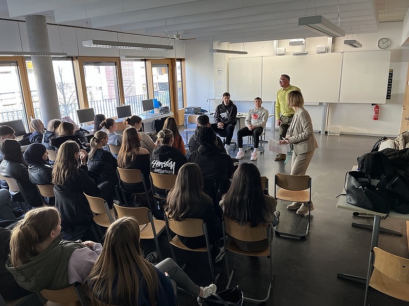 Einen Schulbesuch der besonderen Art erlebten während der „Woche der Fairness“ drei Klassen der Berufsschule B9 am Stadtpark. Leo Saffer und Vincent Friederici von den Nürnberg Falcons waren gemeinsam mit Michael Bayernlein von Hofmann Personal vor Ort, um sich mit angehenden Kaufleuten für Bürokommunikation und Verwaltungsfachangestellten zum Thema „Fairness im Alltag und auf dem Spielfeld“ auszutauschen. Auf Einladung der stellvertretenden Schulleiterin, Silja Bastian, gingen Michael, Alicandra und die beiden Profis in den Austausch mit den 16- bis 25-Jährigen. „Jeder Mensch definiert Fairness anders und hat unterschiedliche Vorstellungen davon, sei es im Privatleben, dem Job, der Schule oder beim Sport. Die Sicht von Profisportlern ist äußerst interessant und ich freue mich sehr darüber, dass mich zwei Spieler der Nürnberg Falcons zu diesem Termin begleitet haben“, so Michael Bayerlein.