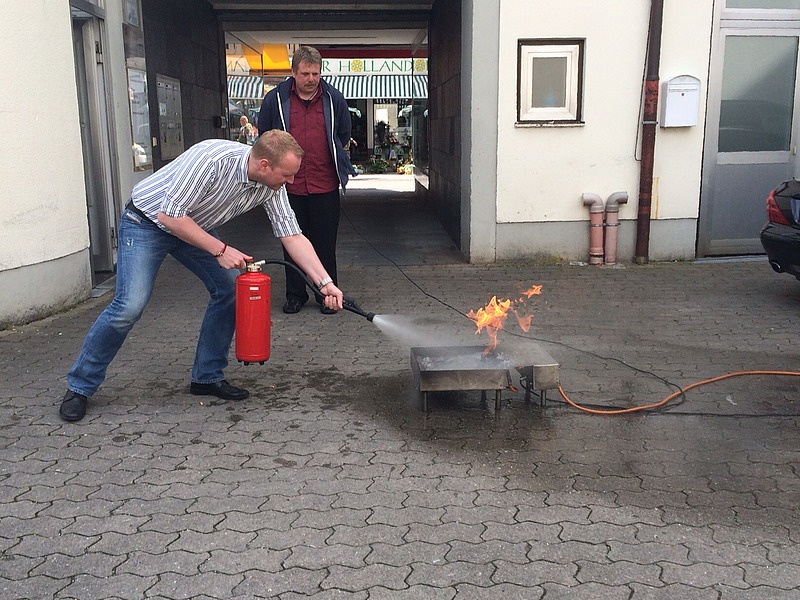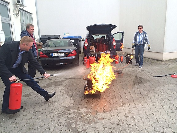 April 2015 - Personalsachbearbeiter Daniel Seiferth stellt fest: „Man meint ja immer, dass Feuer oder andere Katastrophen nur die anderen treffen. Doch es kann anders kommen. Daher ließen wir – für den Fall der Fälle - neun unserer Mitarbeiter diesbezüglich schulen.“ Die Kollegen lernten alles, worauf es beim Löschen ankommt, unter anderem auch, welchen Feuerlöscher man für welchen Brand verwendet. Danach wurden im Hof diverse Löschübungen durchgeführt.
