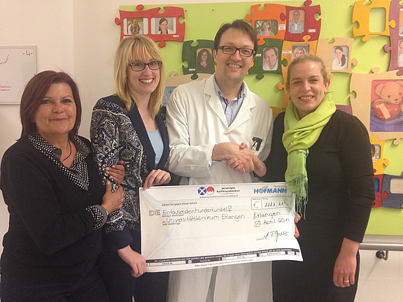 Den Erlös von 500 Euro, den die I.K. Hofmann auf 1000 Euro verdoppelt hatte, übergab jetzt die Büroverantwortliche Tina Giehler an Prof. Dr. med. Markus Metzler, Leiter der Kinderkrebsstation des Erlanger Universitätsklinikums. „Wir freuen uns, dass wir die Kinderkrebsstation mit dieser Spende unterstützen können und sagen an dieser Stelle nochmals herzlich Danke an den phantastischen Künstler Michael Engelhardt und den Wohltäter Michael Böres, der das Bild ersteigert hat“, so Tina Giehler.