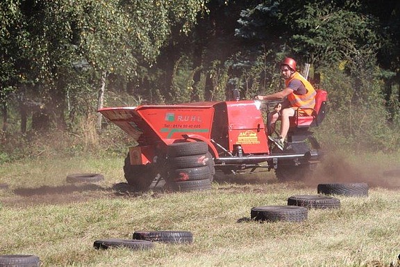 Los ging‘s um 14.oo Uhr mit Start auf der Wiese. Dann musste man durch einen Biertunnel, der aus leeren Bierkästen links und rechts bestand, eine scharfe Asphaltkurve nehmen, was gar nicht so einfach war. Denn der Reifen liegt auf dem Asphalt ganz anders auf, als auf der Wiese und da braucht man schon ein sicheres Händchen. Immerhin fährt so ein Geschoss bis zu 40 km/h! Dann bangten zwei Birken um ihr Leben, um die die Racer scharfe Kurven zogen - danach ging es ab in die Zielgerade!“
