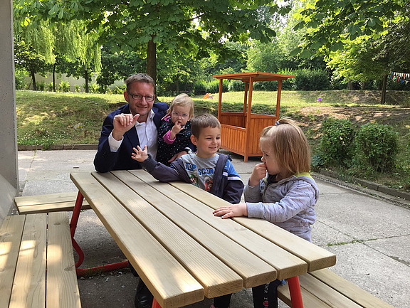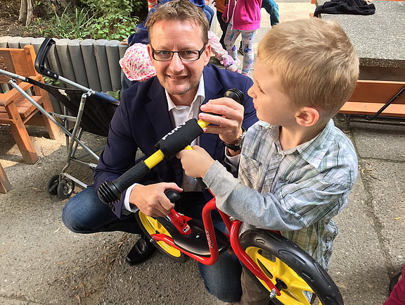 Handeln war gefragt! Darum übergab Marcus Gasch im Rahmen des jährlichen Sommerfests drei neue Puky-Laufräder und ließ sich bei dieser Gelegenheit auch gleich die von Hofmann Personal gesponserten neuen Sitzbänke zeigen.