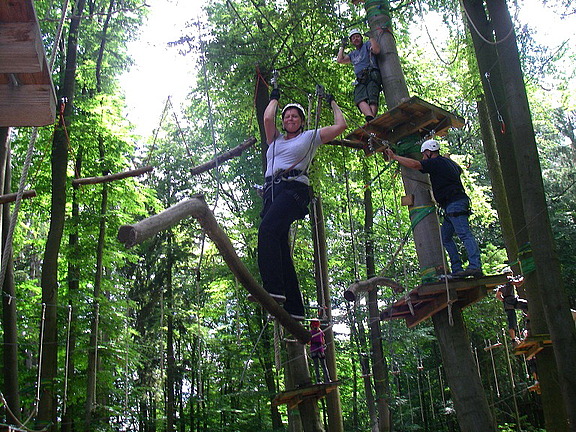 Juli 11 – Unter dem Motto „Fit für den Job“ lud die Niederlassung Marktheidenfeld ihre Mitarbeiter zum Sommerfest nach Haibach ein. Der Tag hielt viele Überraschungen bereit. Zum einen konnten sich die Teilnehmer hoch oben in den Bäumen im Kletterwald auspowern, andererseits brachte Trainerin Moni mit speziellen Übungen am Boden Körper und Geist in Einklang. Durch gegenseitige Hilfestellungen, Vertrauensübungen sowie Gruppenspiele zur Selbst- und Fremdwahrnehmung stellten alle überrascht fest, was sie doch weit mehr leisten können, als sie jemals geglaubt hätten. Da sich auch gleich nebenan ein Wildpark befand, konnten ganz nebenbei auch noch Esel, Reh und Wildschwein in natura aus nächster Nähe betrachtet werden. „Am Ende musste natürlich etwas Ordentliches zu essen her“, erzählt die Büroverantwortliche Carolin Zimmermann. „Darum kehrten wir mittags im Restaurant „Old Church“ ein.“ Begeistert fasste Mitarbeiterin Aydin Melek den Tag kurz und knapp zusammen: „Diesen Tag werde ich nie vergessen!“ Dem kann sich das Team der Niederlassung Marktheidenfeld nur anschließen.