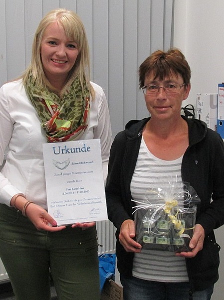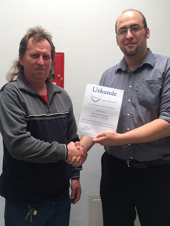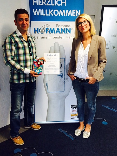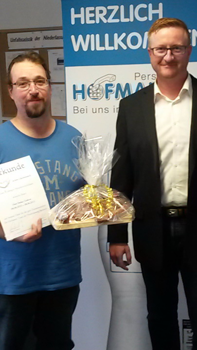 Juni 15 - Die Zeitarbeit ist bunt – und die Betriebszugehörigkeit oftmals sehr unterschiedlich. „Wir haben Mitarbeiter, die über mehrere Jahre bei uns sind und sich sehr wohl fühlen. Das freut uns natürlich und wollten wir mit einem kleinen Geschenk zum Ausdruck bringen“, erzählt Personalsachbearbeiter Daniel Seiferth.