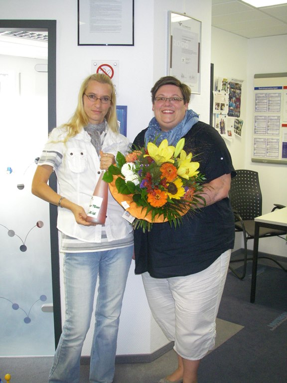 August 2013 – Sie ist patent und hat einen Hang zum Weltenbummeln. Nach Aufenthalten in Österreich und Spanien kam sie aber doch wieder zurück nach Deutschland und nutzte die Zeitarbeit, um schnell auf dem deutschen Arbeitsmarkt Fuß zu fassen. „Ich hätte nicht gedacht, dass ich über die Zeitarbeit so schnell wieder den Einstieg finde und sogar in ein Kundenunternehmen wechseln kann“, stellt die gelernte Köchin Frau Weise fest. „Sie ist einfach hundertprozentig zuverlässig und erbringt gute Leistungen. Das wissen unsere Kunden zu schätzen“, stellt Steffi Wagner fest und übergibt einen bunten Sommerstrauß. Sie bedauert den Fortgang, freute sich aber umso mehr über das Abschiedsgeschenk von Frau Weise – etwas Hochprozentiges!