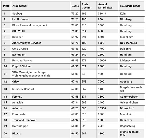 Die Studie, die zwischen dem 8. Mai und dem 10. Juli 2024 durchgeführt wurde, umfasste Unternehmen mit mindestens 500 Beschäftigten in Deutschland. Die Ergebnisse wurden in einen Score zwischen null und 100 umgerechnet, wobei die Bewertungen der eigenen Mitarbeiter und der Branchenkollegen je zur Hälfte in die Wertung einflossen.