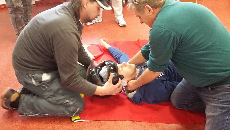 Viel wurde von den Ausbildern gezeigt: die Rettung eines Verletzten aus einem PKW, das richtige Verhalten bei einem Motorradunfall, die Versorgung von größeren und kleineren Wunden, der richtige Einsatz eines Defibrillators sowie die Wiederbelebungsmaßnahmen bei einem Herzstillstand.