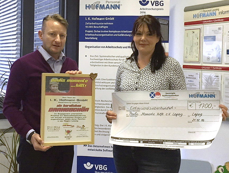 „Diese Schicksale berühren mich sehr. Wie dankbar man sein kann, wenn das eigene Kind gesund ist“, meint Regionalgebietsleiter Marcus Gasch und übergibt an Grit Graser, Mitgründerin des Vereins, einen Scheck über 1700 Euro.