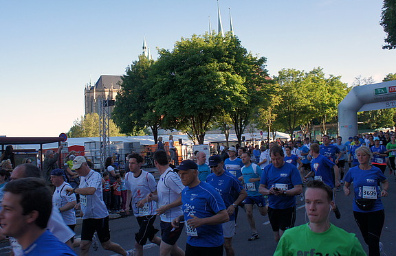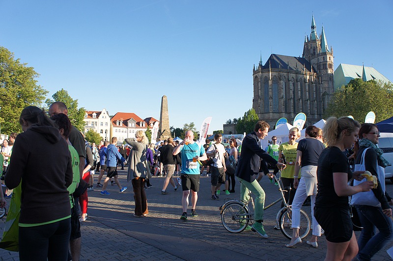 Rund um den Erfurter Domplatz herrschte bereits gut zwei Stunden vor dem offiziellen Beginn reges Treiben. Bei strahlendem Sonnenschein ging es ans gemeinsame Aufwärmen, bei dem man einen guten Blick auf die Bühne erheischen konnte. Untermalt von Musik und diversen Showeinlagen wurde hier die durch die Teilnahmegebühren erwirtschaftete Summe von € 1.700 an die Kinderkrebshilfe übergeben.