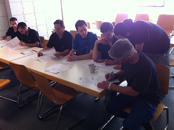 April 2013 – „Arbeits- und Gesundheitsschutz sind Themen, die keinen Stillstand dulden. Wir sehen es als unsere Aufgabe, in diesem Bereich absolut auf Nummer sicher zu gehen. Daher arbeiten wir Hand in Hand mit unseren Kunden zusammen und machen uns regelmäßig direkt am Produktionsarbeitsplatz selbst ein Bild zu den Arbeitsbedingungen. Zudem sorgen wir für umfassende Aufklärung unserer Mitarbeiter und führen regelmäßig Unterweisungen durch“, sagt Büroverantwortlicher Jan Flechtenmacher. So geschehen im April, als zehn Hofmann-Mitarbeiter in den Räumen des Kunden eines dieser regelmäßig stattfindenden Seminare besuchten.