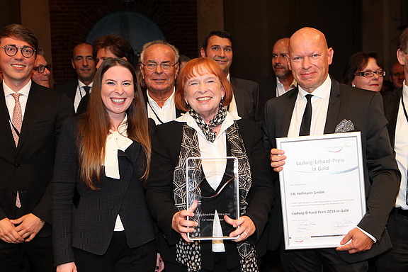 Juni 18 – Die I.K. Hofmann GmbH hat in der Kategorie „Große Unternehmen“ den Ludwig Erhard Preis in Gold gewonnen, die höchste Auszeichnung für Unternehmensqualität in Deutschland. „Im Vergleich zu 2010, als wir ebenfalls bester Preisträger waren, allerdings noch in der Kategorie „Mittlere Unternehmen“, haben wir uns im Punktestand weiter verbessern können. Wir machen schon vieles sehr gut, aber Potentiale gibt es natürlich immer. Schließlich wandeln sich die Anforderungen an Unternehmen ständig. Durch die Teilnahme u.a.an diesem Wettbewerb können wir umfassend prüfen, ob wir den heutigen Anforderungen genügen, wobei vor allem die Kunden- und Mitarbeiteranforderungen im Focus stehen“, sagte die Unternehmerin Ingrid Hofmann bei der Preisverleihung am 15. Juni 2018 in Berlin.