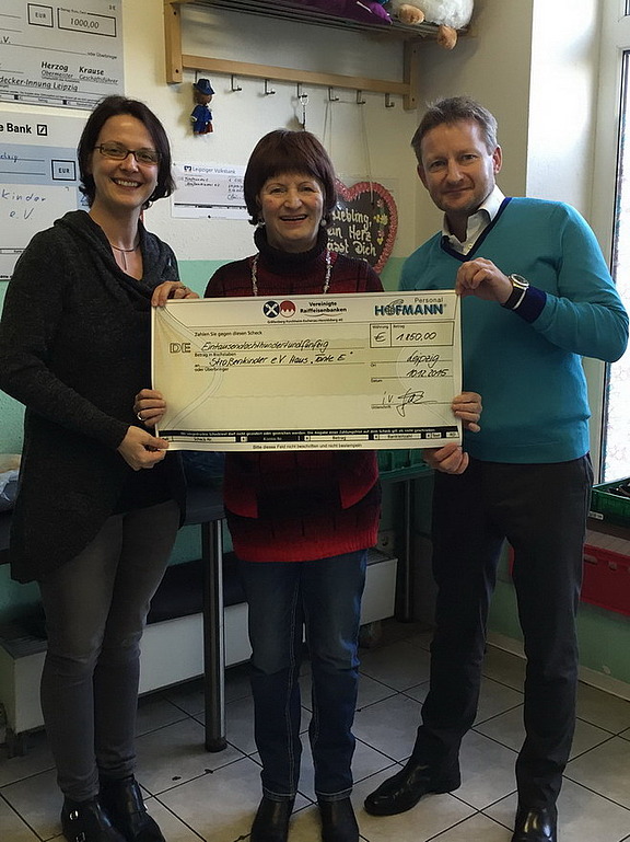 1850 Euro konnten Marcus Gasch und Anja Radoi an die Leiterin Gabi Edler übergeben. Das Geld wurde im Laufe des Jahres von den Hofmann-Mitarbeitern „ersportelt“. Dahinter steckt die Idee des Hofmann Spendenmarathons: Für jede gemeldete Teilnahme an einem Sportevent durch Kunden oder Mitarbeiter spendiert die Hofmann-Verwaltung dem Niederlassungsteam 50 Euro. Das auf einem Spendenkonto gesammelte Geld kommt später einer sozialen Einrichtung der Region zugute.