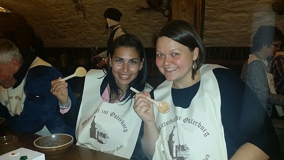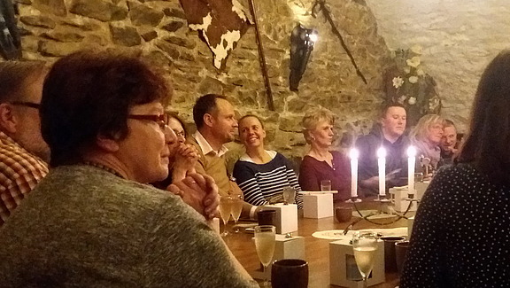 Oktober 2016 – „Versuchen Sie mal, eine Ente mit einem Holzlöffel zu essen. Da braucht es Geschick“, lacht Personalsachbearbeiterin Heike Gäbler. „Aber unsere Kunden meisterten diese Herausforderungen natürlich mit Bravour. Somit ist niemand verhungert. Ganz im Gegenteil: Wir haben unseren gemeinsamen mittelalterlichen Abend auf der Osterburg richtig genossen und konnten uns so für eine gute Zusammenarbeit bedanken.“