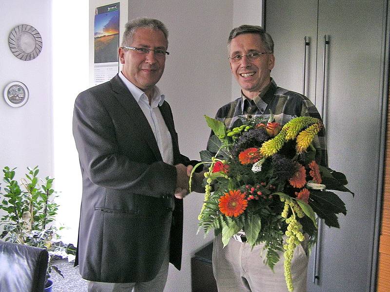 August 2012 - „Es erfüllt uns mit Stolz und freut uns sehr, dass unsere gewerblichen Mitarbeiter in einem ortsansässigen Spitzenbetrieb der Metallbranche mit gutem Betriebsklima und sozialem Engagement eingesetzt sind,“ so Regionalleiter Frank van Hees und übergibt Mathias Kröckel, der sein Unternehmen „MKS Kröckel“ in den vergangenen 20 Jahren zu einem Spitzenbetrieb der Metallbranche ausgebaut hat, einen farbenfrohen Blumenstrauss. Seit 1992 ist die Mitarbeiterzahl des seit vier Generationen geführten Unternehmens von ehemals fünf auf mittlerweile 72 gestiegen. Zudem konnte der Betrieb in den letzten Jahren trotz mancher Wirtschaftskrise erhebliche Umsatzsteigerungen erzielen.