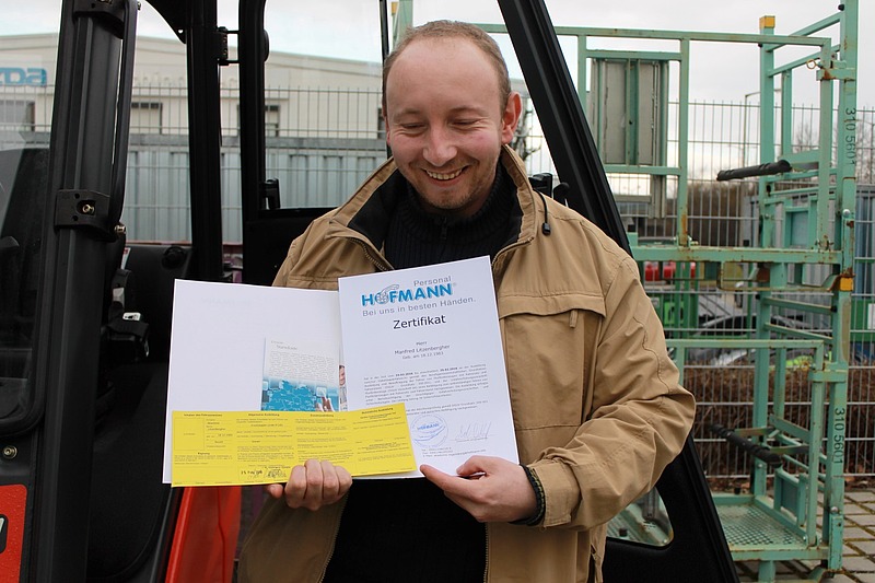 Februar 2016 - Andreas Lichtenfeld, Akademieleiter Regensburg, freut sich: „Fortbildungen sind eine gute Chance, den eigenen „Marktwert“ sozusagen zu erhöhen. Wir setzen uns dafür ein, dass unsere Bewerber dabei unterstützt werden. Manfred Litzenbergher hat alles richtig gemacht. Er hat sich auf die Fortbildung eingelassen und hat die Prüfung für den Gabelstaplerschein erfolgreich bestanden. In Kombination mit seiner bisherigen Berufserfahrung haben wir nun auch einen interessanten Kundeneinsatz für ihn.“