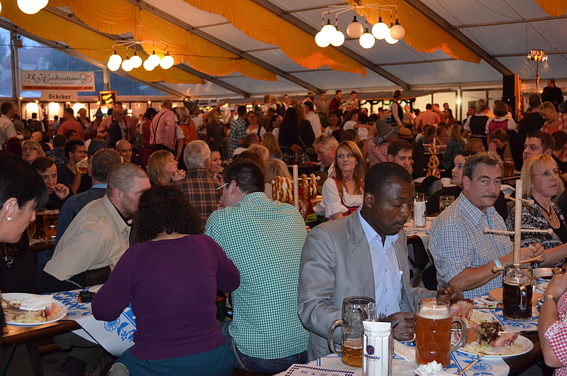 Mit einem Feiertrupp von insgesamt 90 Personen war die Stimmung bombig. „Die wilden Buben“ waren wieder mit dabei und rissen das Publikum mit - Schunkeln und Mitsingen inbegriffen. Die Kulinarik war eher „deftig“: es gab leckere Hähnchen, Schweinshaxn, Weißwurst und vieles mehr – all das, was bayerisches Feeling nach Berlin brachte und so durfte auch die eine oder andere Maß nicht fehlen.