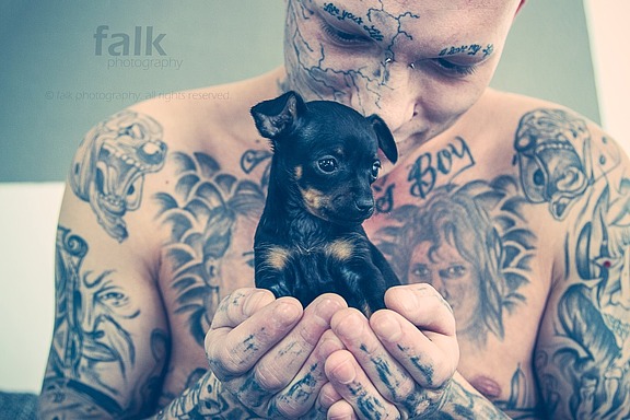 „Mein Berufsweg ging ein wenig hin und her. Nach der Hauptschule absolvierte ich das Berufsgrundschuljahr für Schreiner, um mich in diesem Beruf ausbilden zu lassen. Allerdings habe ich die Ausbildung nicht abgeschlossen. Naja, die Jugend halt!“, lacht er und ergänzt: „Mit 18 Jahren habe ich dann das erste Tattoo stechen lassen. Mit diversen Gelegenheitsjobs hielt ich mich über Wasser, wobei die Leute nie irgendwelche Vorurteile wegen meines Aussehens hatten. Ich glaube, es lag einfach am schlechten Arbeitsmarkt, dass ich bislang noch nirgends sicher gelandet war“, sagt er.