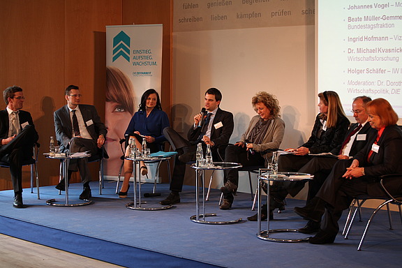 Bedauerlicherweise musste die Diskussionsrunde sehr kurz gehalten werden, da an diesem Tag überraschend die namentliche Abstimmung der Frauenquote angesetzt worden war und die Abgeordneten daran teilnehmen wollten. Manche interessante Frage der Moderatorin und Wirtschaftsredakteurin Dr. Dorothea Siems konnte nicht gestellt werden. Doch die Diskussion wird weitergehen!