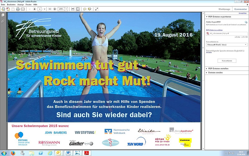 Volker Rinne, Netzwerk für die Versorgung schwerkranker Kinder und Jugendlicher, freut sich: „Am 19. August heißt es wieder „Schwimmen tut gut - Rock macht Mut“. Dann wird im Kleefelder Annabad wieder zu rockigen Klängen für die verbesserte Versorgung schwerkranker Kinder und Jugendlicher geschwommen. Von 18:00 bis 21:00 Uhr können Schwimmer aller Altersklassen pro geschwommenen 100 Metern eine Spende von 5 Euro durch die Schwimmbahnpaten realisieren. Durch die Spende der Firma Hofmann Personal können 10 000 Meter abgeschwommen werden.“
