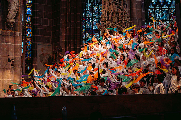 In der prallgefüllten Lorenzkirche in Nürnberg wurde Ende vergangener Woche ein ganz besonderes Kapitel aufgeschlagen: 200 Schülerinnen und Schüler aus vier Nürnberger Schulen erhoben ihre Stimmen, um 80 Jahre nach dem Ende des Zweiten Weltkriegs ein Zeichen für den Frieden zu setzen. Unter der Leitung der renommierten Musikpädagogin Friedhilde Trüün präsentierten die Kinder das Programm SingFrieden – ein Auftragswerk des Musikfests ION, das Hofmann Personal seit 2020 unterstützt.