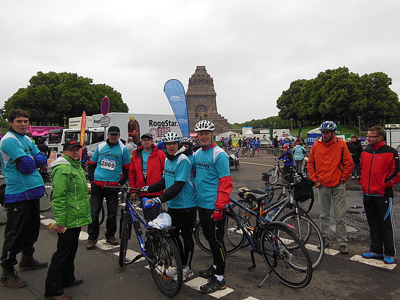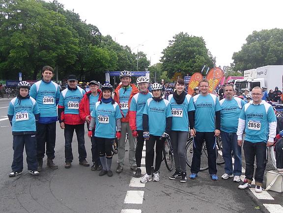Juni 2013 – Sie radeln wieder!Hofmann-Mitarbeiter mit Kind und Kegel trafen sich Anfang Juni vor dem Völkerschlachtdenkmal, um am „LVZ-Fahrradfest“ teilzunehmen und damit den Hofmann-Spendenmarathon „anzukurbeln“.