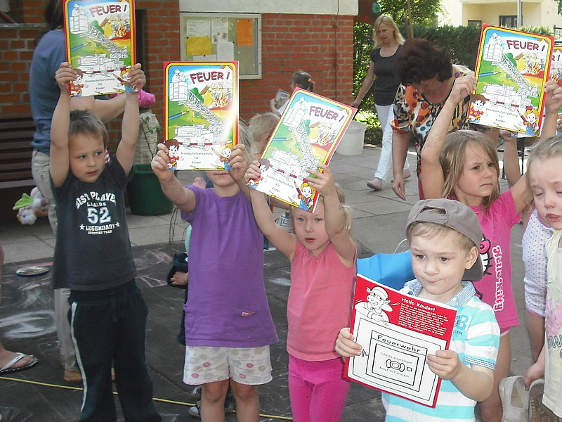 Oktober 2013 – „Mit dem Feuer spielt man nicht!“ Wer kennt nicht diesen berühmten Satz aus eigenen Kindertagen. Um den Kleinen der KITA Parkspatzen das Thema „Feuer“ möglichst anschaulich zu erläutern, überreichten Christine Kochan und Janine Olberts der Leiterin Kristina Buder einen großen Stapel schöner Malbücher zum Thema Feuerwehr und Brandverhütung.