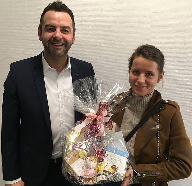 März 2019– „Auch Kamila Krzak gehört seit fünf Jahren zu unserem Hofmann Team und macht einen hervorragenden Job für uns und unsere Kunden“, erzählt Büroverantwortlicher Erich Girnuweit und übergibt unserer Mitarbeiterin einen großen Geschenkkorb, gut gefüllt mit diversen Leckereien. Die Antwort von Kamila Krzak: „Sicherlich werden wir auch die nächsten Jahre gut miteinander arbeiten. Ich freue mich darauf.“