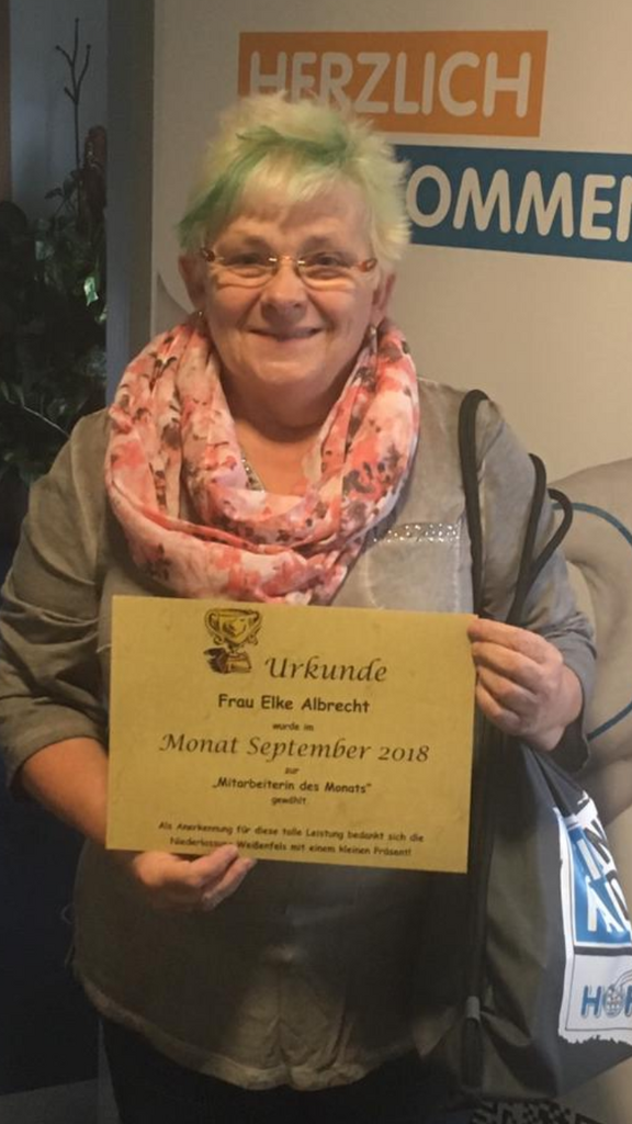 Oktober 2018 - Claudia Pfannschmidt freut sich: „Wir können immer wieder Top-Mitarbeiter zum Mitarbeiter des Monats küren. Elke Albrecht gehört dazu. Sie besticht durch ihre Zuverlässigkeit und Leistungsbereitschaft. Der Kunde signalisiert uns ebenfalls seine große Zufriedenheit, seitdem sie vor fünf Monaten bei uns begonnen hat.“ Wir sagen: Herzlichen Dank!