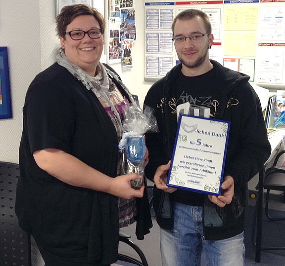 „Auch wir empfinden Stolz, wenn Mitarbeiter gerne bei uns sind und ihre Firmenjubiläen feiern“, sagt Steffi Wagner „Herr Kindl ist ein ausgesprochen engagierter und flexibler Mitarbeiter, der bereits bei verschiedenen Kunden zuverlässig im Einsatz war. Da es der Wirtschaft momentan gut geht, ist er seit längerem bei einem Kunden, der sehr zufrieden ist und Herrn Kindls Arbeitsleistung lobt.“