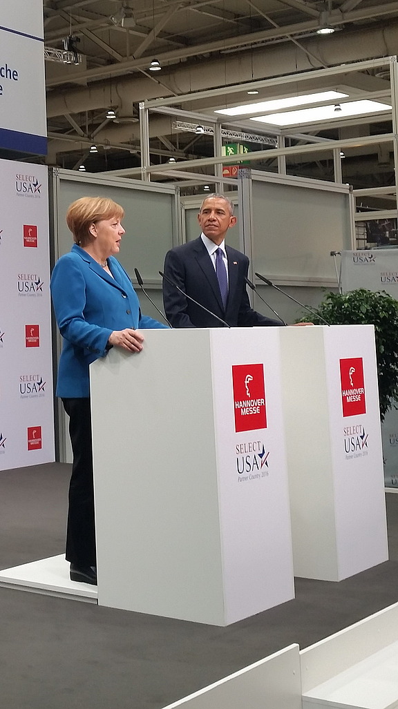April 2016 - Die USA waren zum ersten Mal Partnerland der HANNOVER MESSE. Der amerikanische Präsident Barack Obama eröffnete daher gemeinsam mit Bundeskanzlerin Angela Merkel die HANNOVER MESSE 2016. Er informierte sich zunächst persönlich vor Ort über zukunftsweisende Technologien; später fand der traditionelle Messerundgang von Bundeskanzlerin Angela Merkel statt.